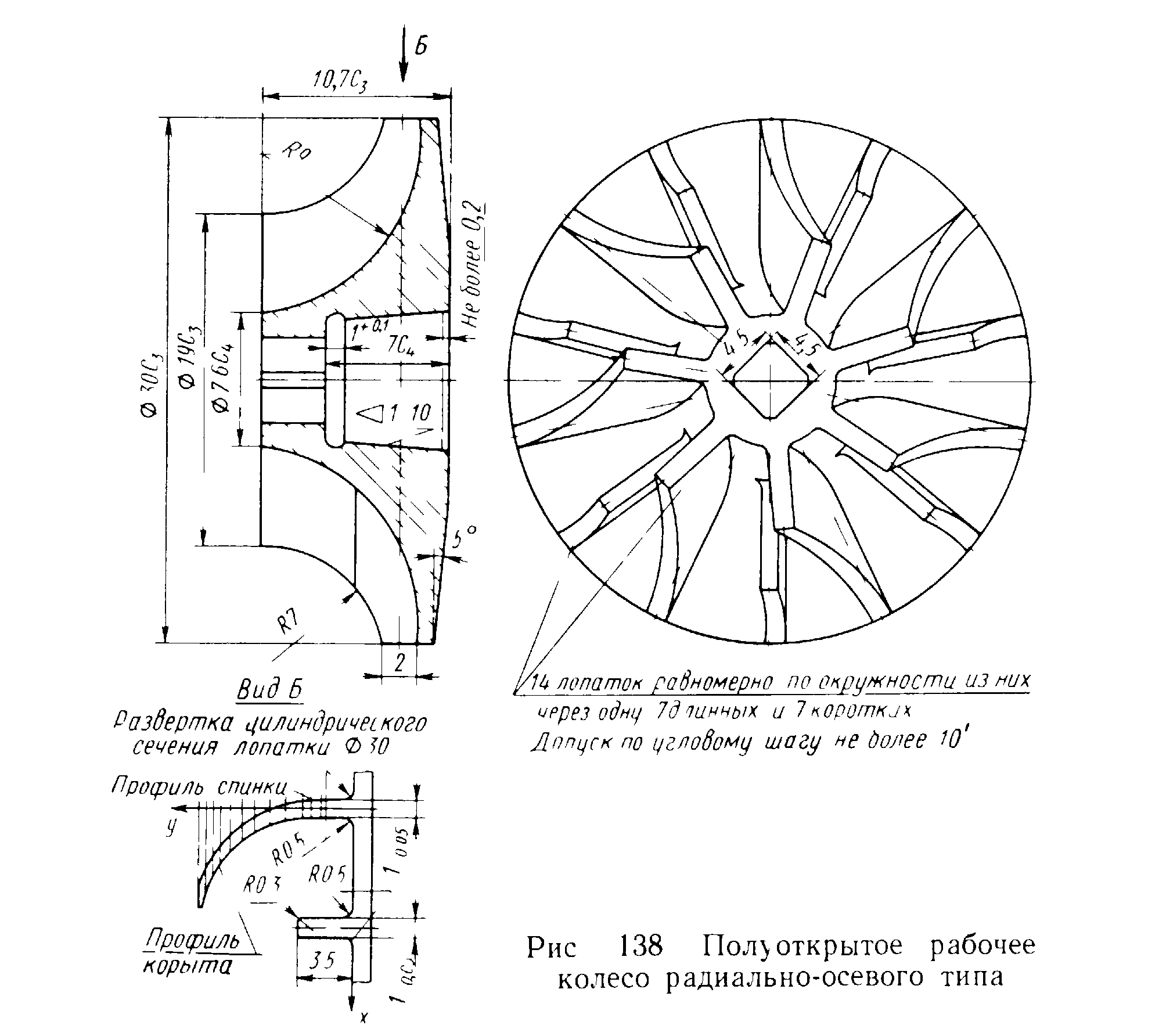Г Окончательная механическая обработка рабочих колес и зачеканка лабиринтных гребней производятся после клепки. Рабочие колеса с односторонним выходом газа, располагаемые на консоли вала, соединяются с валом на конической посадке с конусностью 1 : 10. Для передачи крутящего момента служат две призматические шпонки. Колесо крепится к валу болтом, головка которого образует внутренние стенки выходного канала воронки рабочего колеса. Применене конической посадки позволяет производить многократные разборку и сборку ротора без нарушения характера посадки. Рабочие колеса малых турбодетандеров (диаметром d1 < 100 мм) выполняются большей частью в виде полуоткрытых колес радиально-осевого типа с углом установки лопаток на входе, равным 90° (рис. 3). Подобные рабочие колеса обладают большой механической прочностью, так как лопатки испытывают только растягивающие нагрузки; изготовленные из алюминиевого сплава АК6, они могут надежно работать при окружной скорости до 500 м/с.