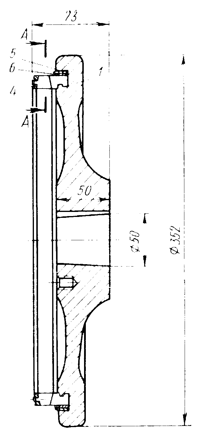 Рис. 5. Рабочее колесо активного турбодетандера с наборными лопатками: 1 - диск рабочего колеса; 2 - сопатка; 3 – проставка; 4 - ободок; 5 - замковое кольцо; 6 - клиновое кольцо. После окончательного изготовления рабочие колеса сравнительно больших диаметров (d1100 мм) подвергаются статической балансировке в специальных качалках. Допустимая величина небаланса принимается такой, чтобы вызываемое ею смещение центра тяжести рабочего колеса с оси вращения не превышало 5 мкм. |