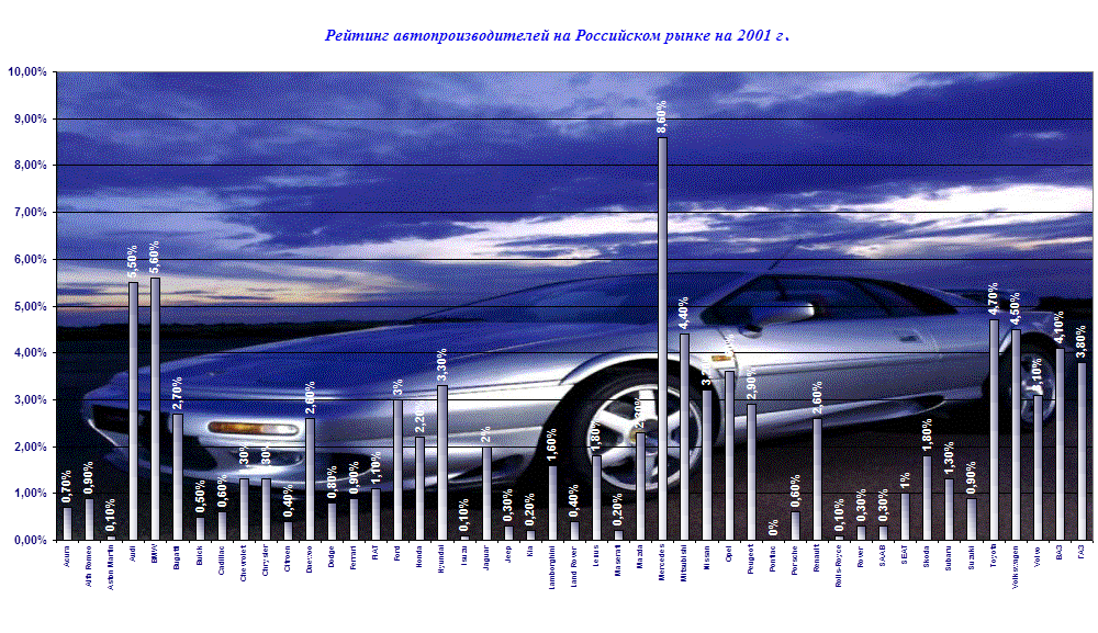 2 ВведениеВ последнее время в нашей стране наметилась тенденция к росту экономики. Следовательно, образовывается так называемый «средний класс». В связи с этим возникла потребность в определенных моделях автомобилей (бизнес-класс). Этим обуславливается появление и распространение на Российском рынке таких автопроизводителей как BMW и Daimler Benz. Сейчас уже трудно вспомнить, когда Mercedes-Benz и BMW начали конкурировать. Против любой новинки одной компании другая сразу же (или почти сразу же) выставляла свою, аналогичную. «Трешка» BMW и Mercedes С-класса, «пятерка» и Е-класс, «семерка» и «шестисотый»… С расширением модельного ряда соперничество распространяется на новые территории. По прогнозам западных аналитиков Российский рынок является одним из самых перспективных. И поэтому автопроизводители проводят активную политику внедрения на Восток, создавая сборочные предприятия и поставляя новейшие модели в Россию. Следующая диаграмма приведена с учетом спроса на автомобили различных марок.