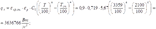 Стефана-Больцмана: C0 = 5,67 Массовая доля конденсата: Z = 0,317; Принимаем оптический диметр частиц: d32 = 3 мкм.; Степень черноты изотермического потока продуктов сгорания: εр = 0,229 +0,061ּd32 + 0,00011ּТ – 0,3684ּZ+0.00502ּp-0,00338ּl = = 0,229 +0,061ּ3 + 0,00011ּ3411 – 0,3684ּ0,317+0.00502ּ10-0,00338ּ0,2547 = 0,6965; Принимаем степень черноты материала: εст. = 0,8; Эффективная степень черноты: εэф.ст. = (1+ εст.)/2 = (1+0,8)/2 = 0,9; Лучистый тепловой поток:
