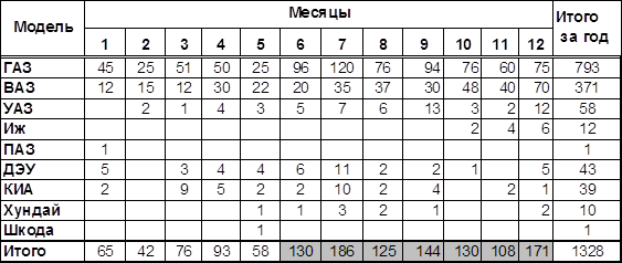 1 2 3 4 цвет Рис.2. Предпочтения потребителей при выборе цвета автомобиля, %. 1 – цветной автомобиль; 2 – белый; 3 – черный; 4 – не имеет значения. Покупатель, стремясь к приобретению автомобиля, придает большое значение всем затратам, которые будут с этим связаны. Покупка транспортного средства это лишь исходный пункт, в ходе эксплуатации возникают дополнительные расходы: на ремонт, регулировку, горюче-смазочные материалы, дополнительное оборудование, инструмент, запасные колеса, шины и многое другое. Таким образом, при покупке автомобиля покупатель несет расходы как по приобретению, так и по его использованию. Поэтому большое значение уделяется выбору той или иной модели автомобиля, в зависимости от назначения, надежности, удобства пользования, внешнего вида и стоимости транспортного средства. 2.7. Изучение покупательского спроса Изучение и прогнозирование покупательского спроса является необходимым маркетинговым условием для проведения успешной коммерческой работы по закупкам товаров. Для проведения работы по изучению и прогнозированию спроса на крупных и средних торговых предприятиях создаются маркетинговые службы (отделы), одной из основных функций которых является изучение как общего объема спроса (емкости рынка), так и внутри групповой структуры спроса на закупаемые товары. На ОАО «Покровск-Лада» подобного специализированного отдела, занимающегося изучением покупательского спроса, нет. Выяснение уровня спроса ведется в течение работы, путем изучения количества продаваемого товара (автомашин, запчастей к ним), оказываемых услуг. Рассмотрим объем реализации автомобилей по маркам и месяцам в течение 2002 года. Как показано в таблице 7, наибольший объем продаж приходится на вторую половину года. Таблица 7 Объем реализации легковых автомобилей за 2002г. на ОАО «Покровск-Лада», шт.