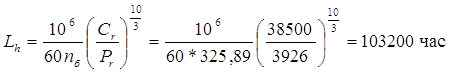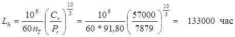 Полученное значение значительно больше минимально допустимого - 20 000 час. Однако, использование подшипника меньшего типоразмера нецелесообразно по конструктивным соображениям. 3.4.2 Рассчитываем подшипники тихоходного вала Вычисляем базовый расчетный ресурс принятого роликоподшипника 7210 ГОСТ 8328-75 Исходные данные: FrA = 6180 Н; FrB = 7497 Н; Fa2 = 747,64 Н; nт = 91,80 об/мин; Базовая динамическая грузоподъемность [3, табл. П.10]: Cr = 57000 кН Факторы нагрузки [2, табл. П.10]: e = 0,37; Y = 1,6 При установке подшипников в распор осевые составляющие: FaA = 0,83 е FrA = 0,83*0,37*6180 = 1898 Н FaB = 0,83 е FrВ = 0,83* 0,37 * 7497 = 2302 Н Расчетная осевая сила для опоры А: FaАр = FaА = 1898 Н Так как FaАр/ FrА < е, то X = 1; Y = 0 Эквивалентная динамическая нагрузка для опоры А: PrА = X FrА + Y FaАр = 1*6180 + 0*1898 = 6180 Н Расчетная осевая сила для опоры В: FaBр = Fa2 + FaB = 747,64+2302 = 3050 Н Так как FaВр/ FrВ = 3050/7497 = 0,41 > е, то X = 0,4; Y = 1,6 Эквивалентная динамическая нагрузка для опоры В: PrВ = X FrВ + Y FaВр = 0,4*7497+1,6*3050 = 7879 Н Расчет ведем по наиболее нагруженной опоре Базовый расчетный ресурс подшипника: