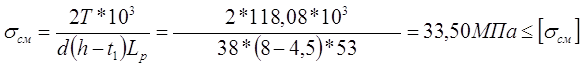 Полученное значение значительно больше минимально допустимого - 20 000 час. Однако, использование подшипника меньшего типоразмера нецелесообразно по конструктивным соображениям. 4 Подбор и проверка шпонокРазмеры поперечного сечения шпонки выбираем в зависимости от диаметра вала. Для крепления шестерни выбираем призматическую шпонку 10 х 8 х 63 по ГОСТ 23360 - 78 [2, табл. 7.7] Размеры шпонки: Высота h = 8 мм; глубина паза вала t1= 4,5 мм; длина L= 63 мм; ширина b= 10 мм Расчетная длина шпонки: Lр= L - b = 63 - 10 = 53 мм Проверяем выбранную шпонку на смятие Допускаемое напряжение смятия [sсм] = 50…60 МПа [2, с. 252]