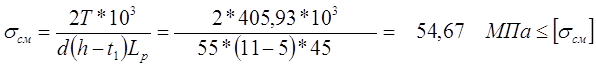 Где Т - передаваемый момент, Н/м, остальные размеры в мм Для крепления колеса выбираем призматическую шпонку 18 х 11 х 63 по ГОСТ 23360 - 78 [2, табл. 7.7] Размеры шпонки: Высота h = 11 мм; глубина паза вала t1= 5 мм; длина L= 63 мм; ширина b= 18 мм Расчетная длина шпонки: Lр= L - b = 63 - 18 = 45 мм Проверяем выбранную шпонку на смятие
