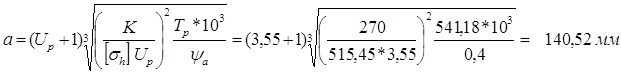 Где Cv = 15 [1, табл. 4.9, с. 95] ya = 0,4 - коэффициент ширины зубчатого колеса [1, табл. 3.3, с. 53] Степень точности передачи - 9 [1, табл. 4.10, с. 96] Kha = 1,1 [1, рис.4.7, с.92]; Kfa = 1 [1, с.92] b/d1 = Ya(Uр+1)/2 = 0,4*(3,55 +1)/2 = 0,91; Khb0 = 1,2 [1, табл. 4.7, с.93] Согласно [1, ф. 4.30, с. 92]: Khb = Khb0 = 1,2 Согласно [1, табл. 4.8, ф. 4.30, с. 94] Kfb = Kfb0 = 1,2 Khv = 1,01; Kfv = 1,01 [1, табл. 4.11, 4.12, с. 96, 97] Коэффициенты нагрузки Kh = 1,1* 1,2 *1,01 » 1,33 Kf = 1* 1,2 *1,01 » 1,21 2.3.3 Основные параметры цилиндрической передачиРасчетный крутящий момент [1] с. 98: Tp = Tт KhДKh = 405,93*1* 1,33 » 541,18 Нм Межосевое расстояние[1, ф. (4.38), с. 98]