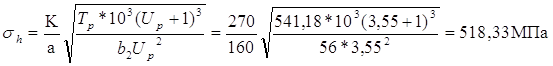 где К = 270 - для косозубых передач 103 - численный коэффициент согласования размерностей Принимаем согласно единого ряда главных параметров [1, с. 51], а = 140 мм Ширина колеса: b2 = a Ya = 140 *0,4 = 56 мм Принимаем b2 = 56 мм Фактическая окружная скорость: V = 2apn1 / ((Uр+1) 60) = 2* 140 *p* 325,89 /(3,55+1)60 = 1,05 м/c Уточняем Kh по [1, рис. 4.7, с. 92]: Kha » 1,1 Проверка по контактным напряжениям [1] ф. (4.41) с. 98