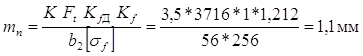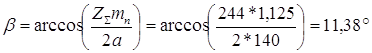 условие контактной прочности выполняется Окружная сила [1,ф.(4.44),с.99]: Модуль [1, ф. (4.45), с. 99]: Где К = 3,5 [1] с. 99 Принимаем согласно рекомендациям [1 с. 53] mn = 1,125 мм Принимаем угол наклона линии зуба b=12° Суммарное число зубьев [1, ф. (4.49), с. 100]: Zå = Z1+Z2 = (2a/mn)cos(b) = (2* 140 / 1,125 )*cos(12°) = 243,45 Принимаем Zå= 244; Число зубьев шестерни и колеса: Z1 = Zå/(U+1) = 244/(3,55+1) = 53,63; Принимаем Z1= 54; Z2 = Zå - Z1 = 244 - 54 = 190 Уточняем угол наклона линии зуба: