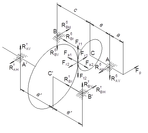 Т. к. колеса нарезаны без смещения исходного контура, для шестерни и колеса Х = 0. 2.3.5 Силы в зацеплении цилиндрической передачиСилы в зацеплении цилиндрической передачи определяем согласно [1] § 4.9 с. 109 Осевая сила Fa = Ft tg(b) = 3716 * tg( 11,38 °) = 747,64 H Радиальная сила Fr = Ft tg(a)/cos(b) = 3716 *tg(20°)/cos( 11,38 °) = 1380 H 3.3.6 Силы в ременной передаче Скорость движения ремня при диаметре быстроходного шкива D = 100 мм: Vр = p nном D/60 = p× 730 ×0,1/60 = 3,82 м/с. Угол охвата a1 = 150°, число ремней Z = 3, масса 1 м длины ремня Б: q = 0,18 кг/м. Коэффициент длины ремня CL = 0,92 [2, табл. 6.14, с 215]. Коэффициент охвата Сa = 0,92 [2, табл. 6.13]. Коэффициент режима работы Ср = 1 [2, табл. 6.5]. Сила натяжения одного клинового ремня: F0 = 780 N CL/(Vр Ca Cp Zр) + q Vр 2 = = 780× 4,24 × 0,92 /( 3,82×0,92×1×3) + 0,18×3,822 = 288,36 Н Сила, действующая на вал: Fp = 2 F0 Z sin(a1/2) = 2× 288,36 ×3×sin(150/2) = 1671 Н 3. Расчет валов, подбор подшипников3.1 Предварительный расчет валовОпределяем диаметры выходных концов валов из расчета на кручение. Материал валов - сталь 40Х ГОСТ 4543-88. d = (T*10 3/0,2 [tk]) 0,33 (5.1) Где [tk] = 45 МПа - допускаемое касательное напряжение [2, стр. 249] d - в мм Хвостовик первичного вала: dхв.1 = (118,08*10 3/0,2*45) 0,33 = 23,59 мм. Принимаем диаметр хвостовика быстроходного вала равным 0,8 диаметра вала электродвигателя d1 = 25 мм. Хвостовик тихоходного вала: dхв.3 = (405,93*10 3/0,2*45) 0,33 = 35,60 мм. Принимаем диаметр хвостовика тихоходного вала 38 мм. Диаметры участков валов в месте посадки зубчатых колес определяем согласно [1, §11.2]: d > (16 T / p [t]) 1/3 Где Т - крутящий момент в Н/мм [t] = 16 МПа [1] d1 > (16* 118,08 /p*16)1/3 = 33,50 мм, принимаем d1 = 38 мм d2 > (16* 405,93/p*16)1/3 = 50,56 мм, принимаем d2 = 55 мм 3.2. Эскизная компоновка валовВыполняем эскизную компоновку валов при разработке сборочного чертежа редуктора. Принимаем предварительно для быстроходного вала подшипники 7207 ГОСТ 333-79, для тихоходного вала редуктора подшипники 7210 ГОСТ 333-79. 3.3 Проверочный расчет валов3.3.1 Схема приложения сил к валам