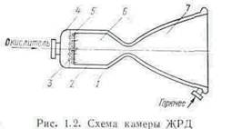 ТЕОРЕТИЧЕСКАЯ ЧАСТЬ. Ракетным двигателем (РД) называют реактивный двигатель, не использующий для своей работы из окружающей среды ни энергию, ни рабочее тело. Таким образом, РД — установка, имеющая источник энергии и запас рабочего тела и предназначенная для получения тяги путем преобразования любого вида энергии в кинетическую энергию рабочего тела, отбрасываемого от двигателя в окружающую среду. Ракетные двигатели обладают тремя основными характерными особенностями: 1) автономность от окружающей среды. Под автономностью РД нельзя понимать независимость его параметров от окружающей среды, так как его выходные параметры в значительной степени зависят от окружающего давления (противодавления). Под автономностью следует понимать лишь способность РД работать без использования окружающей среды. Поэтому эти двигатели могут работать под водой, в атмосфере и в космическом (межпланетном) пространстве; 2) независимость тяги от скорости движения аппарата, так как тяга создается в нем за счет расхода запасов рабочего тела и энергии, имеющихся на этом аппарате. Поэтому эти двигатели способны функционировать при очень больших скоростях движения. 3) высокая концентрация подводимой энергии на единицу массы рабочего тела, обусловленная стремлением получить максимально возможную скорость истечения (отброса) реактивной струи, и, как следствие этого, большая энергонапряженность (теплонапряженность) рабочего процесса и малая удельная масса двигателя, приходящаяся на единицу развиваемой тяги. Из рассмотренных основных характерных особенностей РД вытекают целесообразные области их применения. Большое значение при этом имеет вид запасенной энергии, находящейся на борту ЛА. На современном уровне техники можно использовать в РД энергию, запасенную в форме ядерной, электрической, тепловой и химической. Двигатели, использующие ядерную, электрическую и тепловую энергию, составляют класс нехимических РД. Эти двигатели пока находятся в стадии теоретических разработок и опытных исследований. Большинство практически применяемых в настоящее время РД использую? химическую энергию, носителем которой является топливо. Топливо может быть одно-, двух- .и.. многокомпонентным. Чаще всего используют двухкомпонентное топливо, состоящее из горючего и окислителя. Источником энергии в этом случае является реакция горения (экзотермическая, идущая с выделением тепла). Экзотермической реакцией может быть также реакция разложения некоторых веществ, или ассоциация (рекомбинация) атомов и радикалов. Химическая энергия топлива преобразуется в камере сгорания (КС) в тепловую энергию продуктов реакции (продуктов сгорания). Затем тепловая энергия в сопле переходит в кинетическую энергию вытекающих продуктов сгорания (ПС), в результате чего образуется реактивная сила (тяга). Химические РД (в зависимости от агрегатного состояния топлива до его использования в двигателе) можно разделить на следующие основные группы: жидкостные ракетные двигатели (ЖРД); ракетные двигатели твердого топлива (РДТТ); гибридные (комбинированные) ракетные двигатели (ГРД), использующие топливо смешанного агрегатного состояния. Основной агрегат ЖРД, где создается тяга, — КС двигателя. На рис. 1.2 приведена камера ЖРД, работающая на двухкомпонентном топливе. Она состоит из камеры 