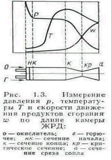 Топливо после воспламенения горит при высоких давлениях (в некоторых случаях до 15—20 МПа и более). При горении топлива образуются газообразные продукты сгорания (рабочее тело), нагретые до высоких температур (3000—4500 К), которые истекают из камеры сгорания в окружающее пространство через сопло. По мере движения ПС по длине сопла температура и давление их уменьшаются, а скорость возрастает, переходя через скорости звука в минимальном (критическом) сечении сопла. На выходе из сопла скорость истечения достигает 2700—4500 м/с. Чем больше секундный расход массы и скорость газа на выходе из сопла, тем больше тяга, создаваемая КС. Примерный характер изменения температуры Т, давления р и скорости w топлива и газов по длине камеры ЖРД изображен на рис. 1.3. Высокие термо- и газодинамические параметры (давление, температура, скорость) газа, а также коррозионное и эрозионное воздействие ПС на стенку камеры создают чрезвычайно тяжелые условия ее работы. Обычно для надежной работы камеры помимо интенсивного наружного (регенеративного) охлаждения применяют специальные методы защиты: пристеночную зону с пониженной температурой газа (внутреннее охлаждение), специальные термостойкие покрытия стенок и т. д. Применение внутреннего охлаждения, как правило, уменьшает удельный импульс, что невыгодно, так как снижается экономичность двигательной установки. В общем же случае ЖРД состоит из КС (или нескольких камер), систем регулирования и подачи компонентов топлива, исполнительных устройств для создания управляющих моментов, соединительных магистралей и т. п. Система регулирования осуществляет автоматическое поддержание или программированное изменение параметров в камере для обеспечения заданных величин тяги, определенного соотношения компонентов, устойчивой работы КС, а также управляет переходными процессами, например запуском и остановкой двигателя. Для системы регулирования применяют различные клапаны, редукторы, запальные устройства и другие элементы, называемые органами автоматики, назначение которых — осуществлять определенные опеоании в заданной последовательности.
