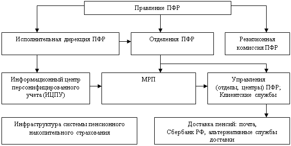 Схема 1. Организация пенсионной системы, формируемой с 2002 года Руководство Пенсионного фонда России осуществляет Правление и его постоянно действующий орган - Исполнительная дирекция. Дирекции подчиняются отделения в республиках в составе РФ, отделения в национально - государственных и административно-территориальных образованиях. Отделения обеспечивают организационную работу по сбору взносов на социальное страхование, финансирование органов социального обеспечения, региональных программ социального обеспечения, а также контроль за расходованием средств. В состав Правления по должности входят председатель, первый заместитель, а также управляющие отделениями фонда. В состав Правления могут также входить представители общественных, религиозных и государственных организаций, объединений, учреждений и предприятий, деятельность которых связана с защитой интересов пенсионеров, инвалидов и детей. В работе Правления ПФР могут принимать участие с правом совещательного голоса управляющие отделениями ПФР по республикам в составе РФ, руководители министерств и ведомств РФ, Банка России. На Правление фонда возлагается ответственность за выполнение функций, относящихся к компетенции ПФР, определение перспективных и текущих задач фонда, составление бюджета ПФР, отчета о его исполнении и сметы расходов на очередной год, а также утверждение структуры ПФР. Кроме того, правление ПФР назначает и освобождает от должности исполнительного директора и его заместителей, председателя ревизионной комиссии ЛФР и руководителей его отделений, издает в пределах своей компетенции нормативные акты, а также решает другие вопросы, относящиеся к его компетенции. В обязанности Пенсионного фонда России входит: 1. Целевой сбор и аккумуляция страховых взносов. 2. Привлечение в Фонд добровольных взносов физических и юридических лиц. 3. Контроль, в том числе и с участием налоговых органов, за своевременным и полным поступлением страховых взносов, а также контроль за правильным и рациональным расходованием его средств. 4. Организация банка данных по всем категориям плательщиков страховых взносов в Пенсионный фонд. 5. Межгосударственное и международное сотрудничество Российской Федерации по вопросам, относящимся к компетенции Пенсионного фонда. 6. Изучение и обобщение практики применения нормативных актов по вопросам уплаты страховых взносов и внесение предложений по ее совершенствованию. 7. Проведение научно - исследовательской работы в области государственного пенсионного страхования. Суть этой работы заключается в создании государственного банка данных плательщиков страховых взносов, разработке и совершенствовании персонифицированного учета страховых взносов. 8. Проведение разъяснительной работы среди населения и юридических лиц по вопросам, относящимся к его компетенции. Средства ПФР находятся в государственной собственности, так как государство несет полную ответственность за своевременную выплату пенсий, пособий, компенсаций. В соответствии с действующим законодательством ПФР финансирует: выплату в соответствии с действующим на территории России законодательством, а также межгосударственными и международными договорами государственных пенсий, в том числе гражданам, выезжающим за пределы Российской Федерации к постоя