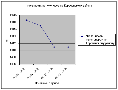 Схема 2. Динамика численности пенсионеров в Корочаском районеза 2010 год Как видно, численность пенсионеров в Корочанском районе с начала 2010 года по июль текучего года сократилось на 15 человек, то есть с 14185 человек до 14109 человек. Однако с июля 2010 года по октябрь 2010 года осталась на прежнем уровне. В целом, по Белгородской области на 2010 год сохраняется положительная динамика в численности пенсионеров. На 01.10.2010 года увеличение составило на 1118 человек, что свидетельствует об удовлетворительном состоянии демографической ситуации с Белгородской области. За октябрь - декабрь 2010 года на территории ГУ УПФР по Корочанскому району Белгородской области ожидается выход на пенсии 73 граждан (из них 70 - по возрасту, 3 - досрочная пенсия). По данным гражданам уже подготовлен макет по обязательному пенсионному страхованию, проведены расчеты, укомплектован соответствующий пакет документов. Одной из главных функций ГУ УПФР по Корочанскому району Белгородской области является информационно - разъяснительная работа с населением. За 3 квартала 2010 года ГУ УПФР по Корочанскому району Белгородской области осуществило в рамках данной работы 10 выходов на телевидение, 110 выходов с объявлениями на радио, 65 выходов в печатных изданиях и 63 размещения информации в глобальной сети Интернет. Конечно, проводится личная работа и консультация сотрудников с населением при отделении ПФ. В Корочанском районе согласно Федеральному закону №21-ФЗ от 04.03.2005 года "О дополнительном ежемесячном материальном обеспечении граждан за выдающиеся достижения и особые заслуги перед Российской Федерацией" 8 пенсионеров имеют право на получение доплат. Все они награждены Орденом Ленина. Также 370 человек имеют право на дополнительное ежемесячное материальное обеспечение в связи с 60-летием Победы в Великой Отечественной войне 1941-1945 годов в соответствии с Указом президента РФ от 30.03.2005 года №363 и от 01.08.2005 года №887. По сведениям о льготах по Федеральному реестру лиц, имеющих право на получение государственной социальной помощи, в соответствии с Федеральным законом от 22.08.2004 года №122-ФЗ в разрезе категорий на 01.10.2010 года в ГУ УПФР по Корочанскому району Белгородской области данный вид социальной помощи получают следующие граждане: Инвалиды ВОВ и приравненные к ним - 73 человека; Ветераны боевых действий - 367 человек; Участники ВОВ - 113 человек; Военнослужащие, проходившие службу в тылу - 1 человек; Несовершеннолетних узник, в том числе инвалида - 25 человек; Члены семей погибших - 44 человека; Инвалиды 1 группы - 763 человека; Инвалиды 2 группы - 7916 человек; Инвалиды 3 группы - 1363 человека; Дети - инвалиды - 157 человек; Инвалиды ЧАЭС - 29 человек; Участники 1986-1987 г. г. - 10 человек; Участники 1988-1990 г. г. - 1 человек; Дети и подростки до 18 лет, проживающие в зоне ЧАЭС - 7 человек; Всего 10878 человек. Информирование застрахованных граждан - важная составляющая работы Отделения пенсионного фонда, так как гражданин вправе знать и своевременно получать информацию о страховых взносах в счет своей будущей пенсии, а значит своего будущего. К тому же данная информация дает возможность двухсторонней связи граждан и сотрудников пенсионного фонда. Владея информацией о состоянии своего лицевого счета и обладая информацией о реализуемых в России программах софинансирования пенсии, дополнительных страховых взносов гражд