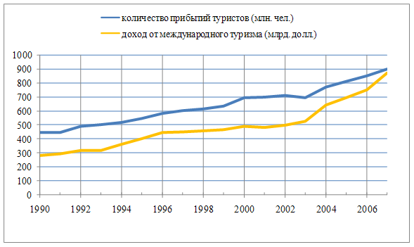 Рисунок 1- Рост прибытий туристов в мире и суммарный экспортный доход с 1990 по 2007 гг. (отчет ВТО за 2008 г. UNWTO Tourism Barometer. Edition 2008) Наибольшее количество туристских прибытий зафиксировано в европейском регионе благодаря объективным историческим и социально-экономическим факторам. Более чем на 9% увеличилось число туристских посещений в Африку, что является самым высоким показателем роста туристских посещений 2006 года. Динамично развивается также Азиатско-Тихоокеанский регион, открывший за последние десятилетия многие важные туристские направления и центры. Основными целями международных туристических прибытий в 2006 году являлись следующие: более половины – 430 миллионов, или 51%, составили поездки с целью отдыха и рекреации, деловой туризм - 131 миллион, или 16%, остальные прибытия пришлись на другие цели, такие как посещения друзей и родственников, паломничество, поездки с целью оздоровления и пр. Следует подчеркнуть, что успехи многих стран в развитии туризма в 2006 году связаны прежде всего с проведением крупных международных событийных мероприятий. К ним относятся как спортивные, так и культурные события, такие как Зимние Олимпийские Игры в Турине, чемпионат мира по футболу в Германии, празднование 400-летия со дня рождения Рембрандта, 250-летия со дня рождения Моцарта, 125-летия со дня рождения Пикассо и многое другое. Таким образом, анализ данных по международным туристским прибытиям и поступлениям от туризма за 2006 год показывает, что мировой туризм в целом не только сохранил свои позиции, но и существенно улучшил их. Согласно предварительным данным динамика международных туристских прибытий и поступлений в целом сохранилась и в 2007 году. Согласно данным ВТО в мире насчитывается 15 стран, специализирующихся на туристических услугах, в которых поступления от туризма превышают доходы от экспорта, нередко во много раз. К ним относятся небольшие островные государства в зоне влажных субтропиков и тропиков — Барбадос, Сейшельские острова и др. У 45 стран поступления от туризма превышают 1/4 часть от объема экспорта. Это в основном развивающиеся государства со слабо развитой экономикой. Исключение составляют Австрия, Испания, Португалия и др. [12, с.256]. Под поступлениями от международного туризма понимается плата за товары и услуги, произведенная иностранными туристами во время их пребывания в стране, за исключением прибыли от дополнительной занятости и оплаты международного транспорта. Международные туристические расходы включают оплату продуктов и услуг, произведенных жителями данной страны за границей [10, с.528]. Расходы американских туристов за рубежом также оказались выше, чем расходы туристов из других стран. Соотношение между доходами и расходами от международного туризма в странах и регионах различается. Наибольшее положительное сальдо имеет Испания (+14 339 млн. дол.), затем Франция (+7761 млн. дол.].), Австрия (+6805 млн. дол.) и Италия (+5916 млн. дол.), а наибольшее отрицательное сальдо - Япония ( - 21 350 млн. дол.) и Германия (—19 153 млн. дол.) [10] . Лидерами по объему потребительских расходов в сфере международного туризма являются Германия, США, Великобритания (таблица 1). Обычно считается, что помимо расходов на проезд в страну и обратно иностранный турист затрачивает на питание около 40% своих расходов, на проживание — 30%, на проезд внутри страны — 8%, пр