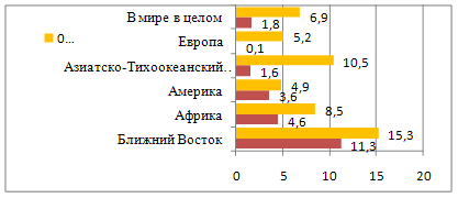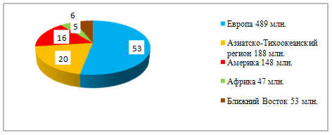 Вторая половина года показала резкое изменение: число поездок либо не росло, либо сокращалось. Между январем и июнем число туристических прибытий выросло на 5%, тогда как во второй половине 2008 года оно сократилось на 1% (рисунок 2). В целом по 2008 году все регионы мира показали положительную динамику, исключая Европу, где отмечалось сокращение прибытий. Лучшие результаты были зафиксированы на Ближнем Востоке (+11%), в Африке (+5%) и в обеих Америках (+4%). На американском континенте хорошая статистика была достигнута за счет большого числа поездок в США до августа и традиционной популярности стран Центральной и Южной Америки [14].