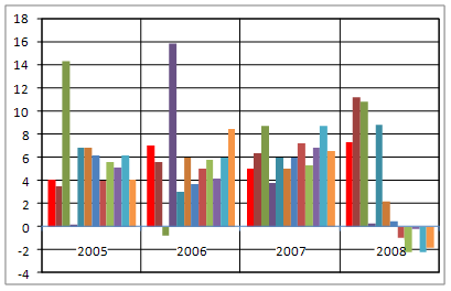 Рисунок 2 - Рост прибытий в % по сравнению с тем же периодом предыдущего года 2007, 2008 гг. (UNWTO Tourism Barometer. Edition 2009_01) Число поездок сокращалось в последние шесть месяцев года и в Европе (-3%), и в Азии (-3%). В Азии падение было даже более значительным из-за того, что в 2007 году континент пережил двукратный рост числа прибытий, и эта тенденция продолжилась в первой половине 2008 года (+6%). Несмотря на общую негативную ситуацию, некоторые направления в 2008 году показали очень хорошие результаты (рисунок 3). В первую очередь, это Гондурас, Никарагуа, Панама, Уругвай, Корея, Макао (Китай), Индонезия, Индия, Египет, Ливан, Иордания, Марокко и Турция [14].