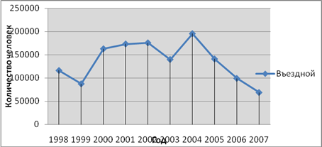 Рисунок 1 – Показатели въезда иностранных туристов в Приморский край После изучения показателей въезда иностранных туристов в Приморский край (Рисунок 1) можно сделать вывод, что наибольший поток туристов прибыл в 2004г. и после этого большого скачка, количество приезжающих туристов стало сильно снижаться. Также снижение потока туристов происходило в 1998 -1999гг. это было вызвано дефолтом и бедственным экономическим положение России в целом. Что касается 2003г., то в этот период времени наблюдается также резкое снижение, так как была так называемая атипичная пневмония. Несмотря на очевидное уменьшение потоков въезжающих в край туристов из КНР, вырос въезд туристов из Японии и Республики Корея. Если в 1998 году количество японских туристов, посетивших край, составляло 3100 человек, то в 2007 году их количество достигло 5529 человек, что является существенным, особенно в условиях нынешнего мирового кризиса. Количество туристов из Кореи также увеличилось: в 1998 году – 1000 человек, в 2007 году – 6991 человек. Однако показатели въезда туристов из Китая уменьшились в два раза, и в 2007 году их количество составляло лишь 50346 человек (по сравнению с 109400 человек в 1998 году).