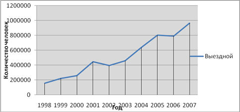 Рисунок 2 – Показатели выезда российских туристов за пределы Приморского края Что касается показателей выезда российских туристов за пределы Приморского края, то очевидно, что они выросли. Если в 1998г. количество выезжающих людей составляло около 15000человек, то в 2007г. эта цифра была равна 964001человек, это, безусловно связанно с улучшением качества жизни людей. Делая вывод, можно отметить, что в Приморском крае преимущественно преобладает выездной турим. Это связанно непосредственно с неразвитостью инфраструктуры Приморского края. 2.4 Тенденции на туристском рынке Приморского краяВ настоящее время Приморский край стабильно занимает 4-е место в Российской Федерации по предоставлению туристских услуг (после городов Москва, Санкт-Петербург и Краснодарского края). В крае имеется достаточный потенциал для развития туристической отрасли. Прежде всего, это географическое и геополитическое положения края в Азиатско-Тихоокеанском регионе. Огромное значение для развития туризма в Приморье имеют так же уникальные природные богатства района и неповторимое сочетание множества различных культур, населяющих край. Владивосток долгое время был закрытым городом, лишь с начала 90-х он стал доступен для широкого потока как отечественных, так и иностранных туристов. Этим отчасти можно объяснить неразвитость туристской инфраструктуры города. То, что Владивосток может стать городом проведения форума АТЭС в 2012 г., конечно же, даёт надежду в развитие здесь туристской инфраструктуры. В Приморском крае международный туризм носит сильно выраженный региональный характер. Популярным направлениями для въездного и выездного туризма является Китайская Народная Республика. Так как в силу географического положения, наличия транспортной инфраструктуры и пунктов пропуска через государственную границу, Китай является самым выгодным и перспективным соседом края. Однако существуют некоторые аспекты, которые способны удержать определенное количество туристов от поездок в Китай, это такие факторы как: боязнь китайской экспансии, негативное отношение значительной части местного населения к китайцам, недостатки нормативно-правовой базы международного туризма, медленное развитие туристской инфраструктуры.
