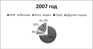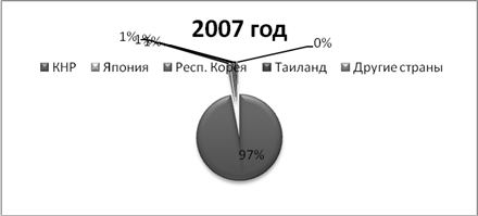 Рисунок 3 – Сравнительная диаграмма показателей въезда иностранных туристов в Приморский край в 2007 г. Рассматривая сравнительную диаграмму показателей въезда иностранных туристов, можно сказать, что большинством являются граждане из КНР. Вообще в 2007г. Приморье посетило около 70 тысяч иностранных туристов. Традиционно большая часть туристов – граждане КНР – более 50 тысяч человек, а также Республики Корея – около 7000человек и Японии (5,5 тысяч человек). Кроме того, возрос въезд туристов из США - на 32, 5%.