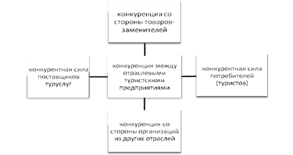 Рисунок 4 – Сравнительная диаграмма показателей выезда российских туристов из Приморского края в 2007 г. Хотелось бы отметить, что наиболее востребованными направлениями при выездном туризме являются такие страны как КНР, Корея и Япония. В общей сложности в 2007 году за границей побывали почти миллион жителей края - 964 тысячи человек, это на 195 тысяч больше, чем в 2006 году. В целом показатели выездного туризма увеличились более чем на 20 %. В итоге хотелось бы отметить, что основным туристским направлением неизменно считается Китайская Народная Республика, как для выездного, так и для въездного туризма. 3. Исследование конкурентов турфирмы «Ольга»Под конкуренцией понимается соперничество на каком-либо поприще между отдельными юридическими или физическими лицами (конкурентами), заинтересованными в достижении одной и той же цели. С точки зрения предприятия такой целью является максимизация прибыли за счет завоевания предпочтений потребителей. Присутствие конкурентов на рынке создает элемент состязательности: продавцы борются за право более эффективно удовлетворить потребности покупателя, сделать его своим постоянным клиентом. Конкуренция есть неотъемлемая часть рыночных отношений, способствующая обогащению предложения на рынке, внедрению новых форм продуктов и сервисного обслуживания потребителей. Цель конкурентной борьбы — занять более прочную позицию на рынке. Для рынка предприятий индустрии гостеприимства и туристического бизнеса характерна высокая степень конкуренции. 3.1 Исследование конкурентной среды по ПортеруМ. Портер выделяет пять сил, формирующих конкурентную среду туристического предприятия (рис. 5)