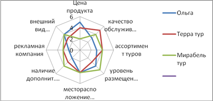 Данная конкурентная карта отражает 16 возможных положений предприятия, каждое из которых отражает его рыночную долю и потенциальные возможности в конкурентной борьбе. Наиболее сильную позицию в анной таблице занимают те предприятия, которые расположены на пересечении столбцов «Лидеры рынка» и «Предприятия с быстро улучшающейся позицией». Самое бедственное положение на пересечении «Партизаны» и «Предприятия с быстро ухудшающейся позицией». Многоугольник конкурентоспособности Для построения многоугольника конкурентоспособности рассматриваются туристические фирмы, которые входят в одну стратегическую группу с турфирмой «Ольга», такими турфирмами являются Терра тур и Мирабель тур. Данные турфирмы были оценены по следующим 8 критериям: Øцена продукта (чем выше цена, тем ниже оценка и наоборот); Øместорасположение турфирмы; Øкачество обслуживания; Øуровень размещения; Øвнешний вид предприятия; Øассортимент туров; Øрекламная компания; Øналичие дополнительных услуг