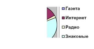 Рисунок 9. Результаты ответов на вопрос «Откуда Вы узнали о турфирме «Ольга»?» После рассмотрения данной диаграммы (Рисунок 9), хотелось бы обратить внимание на процентное соотношение источников: впервые узнал о турфирме «Ольга» из газеты – 5%, из Интернета – 12%, по радио – 2%, и от знакомых – 81% опрашиваемых. Что касается пункта №8, проводимого анкетирования, который звучит следующим образом «Оцените обслуживание персонала турфирмы «Ольга» по пяти – бальной системе (1балл – очень плохо, 5 – очень хорошо)», то результаты были следующими: 1балл – 0%, 2балла – 1%, 3балла – 20%, 4балла – 73%, 5баллов – 6%.