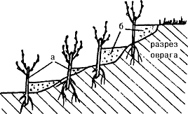 оврага кольями вербы и тополя: а - колья ивы и тополя, б - земля.