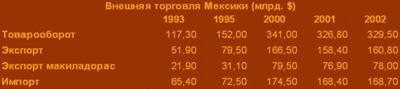 В городах вдоль северной границы Мексики имеется большое число предприятий, работающих только на экспорт и принадлежащих иностранным, в основном американским промышленным компаниям, которым разрешено беспошлинно ввозить сырье или детали последующего реэкспорта. Эти предприятия в Мексике получили название «макиладорас». Основными видами продукции являются текстиль, игрушки, электротовары и электроника. Промышленники США используют Мексику в качестве «инвестиционной экспортной платформы» в основном из-за дешевой, относительно квалифицированной и большой по численности рабочей силы. Мексиканское правительство поощряет их, так как они создают большое количество рабочих мест. На макиладорас почти не повлиял экономический кризис 1995–1996, и темпы роста их производства значительно превышали темпы роста экономики страны в целом. Возможность получения рабочих мест в макиладорас вызвала большой приток рабочей силы, в основном молодых женщин, в северные пограничные города. Организация и планирование производства. Со времен революции 1910 и особенно с 1930-х годов правительство осуществляло политику «мексиканизации» для того, чтобы модернизировать экономику в соответствии с национальными интересами. Многие крупные и принадлежавшие иностранцам поместья были разделены на части и распределены среди безземельных крестьян, были национализированы также сотни промышленных предприятий. Чтобы осуществить свою политику мексиканизации, правительство приняло ряд законов и регулирующих актов, которые определили тип собственности, допустимый в различных отраслях промышленности. Государственной собственностью стали производство электроэнергии, эксплуатация железных дорог, радиосвязи и телеграфной связи, а также нефтяная и нефтехимическая промышленность. Радиовещание, автомобильный транспорт и лесная промышленность должны были полностью принадлежать мексиканцам. Иностранным инвесторам было разрешено иметь только незначительную долю в собственности прочих отраслей промышленности, в том числе в черной металлургии, рыбной, горнодобывающей (за исключением нефтедобычи) и пищевой промышленности. Другие виды экономической деятельности, особенно связанные с импортными компонентами для реэкспорта, могли иметь неограниченную долю иностранной собственности. К 1980-м годам правительство владело или контролировало 2/3 национального производства; обладало полномочиями в зависимости от ситуации отменять или усиливать ограничения на иностранный капитал; умело использовало различные финансовые стимулы или барьеры, импортные лицензии, протекционистские тарифы и контроль за ценами на предметы первой необходимости (основные продукты питания, бензин, телефонная связь, вода, электроэнергия). По предложению Международного валютного фонда (МВФ) правительство пошло на распродажу государственных компаний и снятие ограничений для иностранного капитала. В декабре 1993 мексиканский конгресс принял новый закон об иностранных инвестициях. Этот закон предоставил больше возможностей (не ограниченных конституцией) для иностранной собственности, гарантировал благоприятный климат для большинства иностранных инвесторов, исключил предоставление нормативных документов для реализации их проектов и облегчил получение разрешений в области и