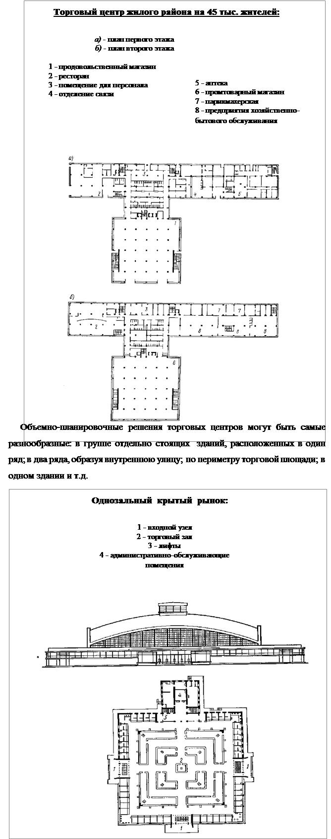 Реферат: Проектирование торговых комплексов и крытых рынковРеферат: Проектирование торговых комплексов и крытых рынковСтроительство культурно-бытовых зданий. Для обеспечения лучшей системы обслуживания населения, а также в целях градостроительства учреждения и предприятия обслуживания располагают в общественных центрах городов планировочных и жилых районов, микрорайонов и сельских населенных пунктов. Общественные здания и предприятия обслуживания формируют общественные центры и являются составной частью планировочной структуры города. В общественных центрах микрорайонов и жилых районов размещают учреждения и предприятия обслуживания микрорайонного и районного значения, в общественных центрах городов и сельских населенных пунктов — учреждения обслуживания городского значения. Для облегчения доступности и создания лучшей связи населения с учреждениями обслуживания устанавливают допустимый радиус в пределах пешеходного сообщения до детских яслей-садов — 300 м, до общеобразовательных школ, предприятий торговли, общественного питания и бытового обслуживания — 500 м. Общественные центры городов проектируют так, чтобы время поездки не превышало 1 ч 30 мин. Классификация общественных зданийОбщественные здания и сооружения предназначены для размещения в них различного вида учреждений и предприятий, призванных обеспечить социальное, бытовое, культурное и коммунальное обслуживание населения. К ним относят учреждения: здравоохранения, физической культуры и социального обеспечения (больницы, госпитали, поликлиники, санатории, дома отдыха, спортивные здания и сооружения, интернаты и др.); просвещения (детские сады, детские ясли, общеобразовательные школы, профтехучилища, техникумы, высшие учебные заведения и др.); культуры (библиотеки, музеи, ботанические сады, дома культуры, клубы и др.); искусства (театры, кинотеатры, цирки, концертные залы ) учреждения науки и научного обслуживания (академии и их филиалы, научно-исследовательские институты, конструкторские бюро архивы и др.); учреждения финансирования, кредитования и государственного страхования (банки, сберегательные кассы и др.); учреждения коммунального хозяйства (гостиницы, дома колхозников, общежития, мотели, кемпинги, пожарные команды и др.); предприятия бытового обслуживания (бани, прачечные, душевые, парикмахерские, дома быта, приемные пункты и др.); 1 торговли и общественного питания (торговые центры, универмаги, магазины, крытые рынки, рестораны, столовые, фабрики, кухни, кафе и др.); связи (почтамты, телеграфы и др ,); транспорта (железнодорожные вокзалы, речные вокзалы, авиавокзалы, автодорожные вокзалы и др.); строительства (проектные и проектно-изыскательские организации, мастерские, проектно-конструкторские и архитектурно-плани- ровочные организации и др.). Основы объемно-планировочных решенийОбщественные здания имеют самую разнообразную объемно-планировочную композицию, зависимую в основном от функционального назначения и архитектурного решения. Тем не менее, из большого круга композиционных форм общественных зданий четко выделяются коридорные и зальные. Большую часть общественных зданий представляет «смешанная группа», получившая более широкое распространение при современном обслуживании населения городов, рабочих поселков и сельских насе