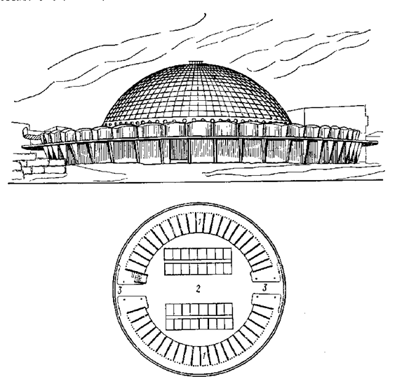 При планировке торговых центров необходимо решить такие основные вопросы, как доступ к месту торговли, подъезды и стоянки легкового транспорта, подъезды грузового транспорта, доставляющего товары в магазины, место разгрузки товаров, место для хранения товаров и использованной тары. Надо проектировать здания так, чтобы доставка товаров, ее разгрузка, распаковка были изолированы от потока покупателей. Кооперированные торговые центры компонуют по ячейковой структуре с сеткой колонн преимущественно 6 X 6 или 6 X 12 м. При проектировании целесообразно предусматривать индивидуальные входы в помещения различного назначения — в отделение связи, аптеку или в помещении бытового обслуживания. Высота торговых залов должна быть 3,3 м при площади до 300 м2, в залах большей площади высоту устанавливают 4,2 м, в подвальных помещениях – 2,7 м, а до выступающих конструкций – не менее 2,4 м. Состав и площади помещений назначают в соответствии с СИиП II-Л. 7-70. Крытые рынкиОдним из комплексов торговых зданий районных и городских центров являются крытые рынки. Такие торговые предприятия, кака крытые рынки, бывают двух типов: рынки для продажи сельскохозяйственных продуктов и комплексные рынки, где есть возможность и продать сельскохозяйственные продукты, и купить необходимые промтовары. В первом типе рынков места продажи сельскохозяйственных продуктов расположены в центре зала и по периметру здания. В крытых рынках предусматривают торговые места постоянные, занимаемые государственными торговыми предприятиями, и разовые, предназначаемые для продажи товаров колхозами и отдельными лицами. Торговые места распределяют по зонам: продажа картофеля, овощей, фруктов, ягод, мяса, дичи, рыбы и т. д. Проходы проектируют различной ширины: основные 4—10 м, боковые 2,5—7 м, поперечные 1,5—5 м. Общую площадь торгового зала рынка устанавливают из расчета 0,5 м2 на одного покупателя, а площадь на одно торговое место принимают от 6 до 13 м2. Температура внутри помещений рынка должна быть зимой не менее +5°С, летом не более 4-18—20° С Композиционное решение рынков — центрическое-компактное, блочное и павильонное. Центрическая композиция более удачна, она требует значительно меньшей площади участка, сметная стоимость зданий меньше на 10—14 и она более экономична и по текущим затратам. Проектирование залов пространственной безопорной структуры с крупнопролетными покрытиями повышает на 7—10% экономичное использование площадей. В рынке проектируют служебно-вспомогательные помещения: санитарного обслуживания, административные помещения. Кроме того, должны быть буфеты и туалеты. В помещениях санитарного обслуживания проверяют продукты, поступающие в продажу. В административно-обслуживающих помещениях продавцы обеспечиваются оборудованием для торговли. В большинстве рынков имеются подвальные помещения, часто обеспеченные холодильниками для хранения не проданных скоропортящихся товаров. В рынках второго типа наряду с продажей сельскохозяйственных продуктов продают промышленные товары. На рисунке (см. рис.ниже) в центрально островных рядах торгуют продуктами сельского хозяйства, а в задней части и по окружности располагают магазины промтоваров. К рынкам должны быть хорошие подходы, не пересекаемые транспортными магистралями, а также подъезды, на площадях перед рынками 