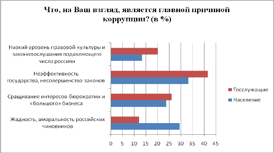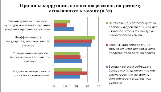 Отметим, что среди населения на жадности и аморальности чиновников акцентируют внимание те, кто считает, что законы нужно соблюдать только в том случае, если это делают представители органов власти, а на низком уровне правовой культуры россиян - та доля опрошенных, которая убеждена, что законы нужно соблюдать в любом случае, даже если они устарели и не вполне адекватны сегодняшним условиям. Диаграмма 2