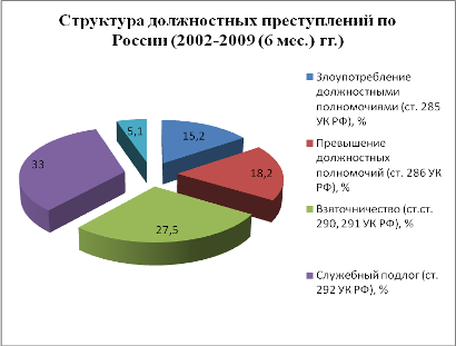 О латентности коррупционной преступности свидетельствуют данные официальной статистики. Преступления против интересов службы в коммерческих и иных организациях, например, занимали в 2002 г. в общей структуре российской преступности 0,27% (были возбуждены 7033 уголовных дел этой категории, в том числе 2780 - по коммерческому подкупу), в 2003 г. - 0,2% (6108 уголовных дел, в том числе 2495 по коммерческому подкупу), в 2004 г. - 0,18% (5308 уголовных дел, в том числе 2020 - по коммерческому подкупу), в 2005 г. - 0,16% (5817 уголовных дел, в том числе 2178 - по коммерческому подкупу), в 2006 г. - 0,13% (4989 уголовных дел, в том числе 1751 - по коммерческому подкупу), в 2007 г. - 0,13% (4631 уголовных дел, в том числе 1786 - по коммерческому подкупу), в 2008 г. - 0,13% (4210 уголовных дел, в том числе 1712 - по коммерческому подкупу), за январь-июнь 2009 г. - 0,2% (3098 уголовных дел, в том числе 1348 - по коммерческому подкупу). Разумеется, приведенные цифры действительности не отражают. Об уровне латентности коммерческого подкупа, в частности, свидетельствует показатель криминала во взяточничестве. В 2002 г. в России зарегистрированы 7311 фактов взяточничества, в 2003 г. - 7346, в 2004 г. - 8928, в 2005 г. - 9821, в 2006 г. - 11063, в 2007 г. - 11616, в 2008 г. - 12512, за январь-июнь 2009 г. - 9141. Таким образом как показывает приведенные данные, уровень выявленного взяточничества выше уровня выявленного коммерческого подкупа в 2002 г. - в 2,6 раза, в 2003 г. - в 2,9, в 2004 г. - в 4,4, в 2005 г. - в 4,5, в 2006 г. - в 6,3, в 2007 г. - в 6,5, в 2008 г. - в 7,3, за январь-июнь 2009 г. - в 6,8. Сфера действия ст. 204 УК РФ (коммерческий подкуп), между тем, много шире сфер действия ст. ст.290 УК РФ (получение взятки) и 291 УК РФ (дача взятки), поскольку число хозяйствующих субъектов в стране исчисляется миллионами и явно больше числа государственных органов, органов местного самоуправления, государственных муниципальных учреждений и других, представленных должностными лицами. С достаточно высокой степенью вероятности, исходя из близости коммерческого подкупа и взяточничества, можно предположить если не превышение первого в структуре преступности по отношению ко второму, то хотя бы их равенство. Таким образом, следует признать, что в структуру преступности попадает лишь один из двух-трех (по 2002-2003 гг.), один из четырех-пяти (по 2004-2005 гг.), один из шести-семи (по 2006 - июнь 2009 гг.) реально совершенных фактов коммерческого подкупа. Это означает уход от уголовной ответственности, по меньшей мере, двух-семи человек на каждого привлеченного к таковой; появление у них, да и у общества в целом, ощущения безнаказанности подобного преступного поведения[43]. Анализ состояния и структуры данных свидетельствует, что среди должностных преступлений преобладают такие, как взяточничество, служебный подлог и превышение должностных полномочий. Диаграмма 3