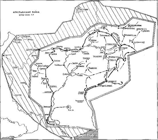КРЕСТЬЯНСКАЯ ВОИНА 1773-1775 ГГ. ПОД ПРЕДВОДИТЕЛЬСТВОМ Е.И.ПУГАЧЕВА НА ТЕРРИТОРИИ БАШКОРТОСТАНА § 1. Начало Крестьянской войны. Боевые действия в Башкортостане на первом этапе народного движения (17 сентября 1773—март 1774 гг.) Причины восстания. Крестьянская война 1773—1775 гг. под предводительством Е. И. Пугачева была самым мощным вооруженным выступлением трудовых масс феодальной России против режима крепостнической эксплуатации и политического бесправия. Она охватила обширную территорию на юго-востоке страны (Оренбургскую, Сибирскую, Казанскую, Нижегородскую, Воронежскую, Астраханскую губернии), где проживало 2 млн. 900 тыс. жителей мужского пола, в своей массе состоящие из крестьян различных категорий и национальностей '. Восстание было следствием углубления кризисных ситуаций в социально-экономической жизни страны, сопровождавшихся усилением феодального и национального угнетения трудовых масс и обострением классовых отношений. Глубокий антагонизм угнетенного населения страны и господствующей верхушки проявлялся в разнообразных формах классовых выступлений трудящихся масс. Кульминацией народной борьбы стало выступление Пугачева, быстро переросшее в широкую крестьянскую войну. Основные события ее разворачивались на Южном Урале. Причины этому следует искать в социально-экономической и политической истории края. К началу Крестьянской войны многонациональное население Башкирии имело двухсотлетний опыт совместного проживания, совместного труда и борьбы. В ходе вольной крестьянской, правительственной и частновладельческой колонизации происходило хозяйственно-бытовое сближение народов разных национальностей и этнических групп, складывалось их взаимопонимание, укреплялась дружба между народами. Абсолютное большинство населения края составляли башкиры, мишари, служилые татары, казаки, не частно владельческие категории крестьянства. Помещичье землевладение не получило широкого распространения. В роли непосредственного эксплуататора трудовых масс выступало само государство. Олицетворением феодального гнета были представители аппарата абсолютистского крепостнического государства, начиная от губернатора и командиров воинских гарнизонов и кончая служителями провинциальных и воеводских канцелярий. Ведущей формой эксплуатации нечастновладельческого крестьянства, нерусских народов, казачества Южного Урала была централизованная рента, представляющая собой совокупность податей и натуральных повинностей в пользу государства2. 1 Кабузан В. М. Изменения в размещении населения России в XVIII—первой половине XIX в. М., 1971. С. 83—102. 2 Назаров В. Д., Рахматуллин М. А. Факторы и формы совместной борьбы народов России в Крестьянской войне под предводительством Е. И. Пугачева (к постановке проблемы) // Народы в Крестьянской войне 1773—1775 гг. Уфа, 1977. С. 35. 294 Глава X Крестьянская воина 1773—/77.5 гг. па территории Башкортостана Усиление позиций феодально-крепостнического государства в Башкирии в середине XVIII в. особенно заметно проявлялось в его земельной и финансовой политике. В связи с возведением разветвленной системы крепостных линий и хозяйственным освоением края были насильственно отторжены казной, расхищены помещиками и заводовла-дельцами огромные земельные территории у башкир. Это вело к обострению пастбищно-земельной тес
