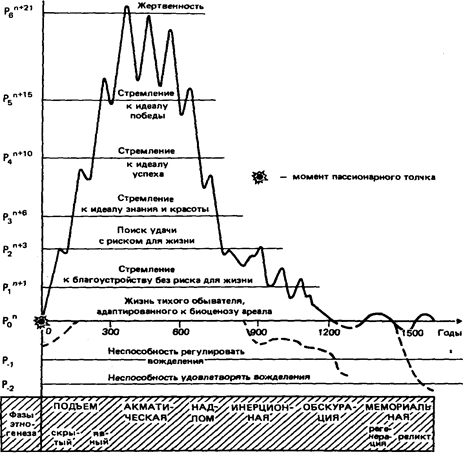 Рис 1. Изменение пассионарного напряжения этнической системы По оси абсцисс отложено время в годах, где исходная точка кривой соответствует моменту пассионарного толчка, послужившего причиной появления этноса. По оси ординат отложено пассионарное напряжение этнической системы в трех шкалах: 1) в качественных характеристиках от уровня Р, (неспособность удовлетворить вожделение) до уровня Рд (жертвенность). Эти характеристики следует рассматривать как некую усредненную «физиономию» представителя этноса. Одновременно в этносе присутствуют представители всех отмеченных на рисунке типов, но господствует статистический тип, соответствующий данному уровню пассионарного напряжения; 2) в шкале - количество субэтносов (подсистем этноса). Индексы п, п+1, п+3 и т. д., где п - число субэтносов в этносе, не затронутом толчком и находящемся в гомеостазе; 3) в шкале - частота событий этнической истории (непрерывная кривая). Предлагаемая Гумилёвым кривая — обобщение 40 индивидуальных кривых этногенеза, построенных нами для различных этносов, возникших вследствие различных толчков. Пунктирной кривой отмечен качественный ход изменения плотности субпассионариев в этносе. Внизу указаны названия фаз этногенеза соответственно отрезкам по шкале времени: подъем, акматическая, надлом, инерционная, обскурация, регенерация, реликт. Как видно из схемы, по абсциссе отложено время в годах. Естественно, на ординате мы откладываем форму энергии, стимулирующую процессы этногенеза. Но перед нами встает другая трудность: еще не найдена мера, по которой бы можно было определять величину пассионарности. На основании доступного нам фактического материала мы можем говорить только о тенденции к подъему или спаду, о большей или меньшей степени пассионарного напряжения. Однако для поставленной нами цели это препятствие преодолимо, ибо мы рассматриваем процессы, а не статистические величины. Поэтому мы можем описать явления этногенеза с достаточной степенью точности, что послужит в дальнейшем базой новых уточнений. В любой науке описание феномена предшествует его измерению и интерпретации; ведь и электричество было сначала открыто как эмпирическое обобщение разнообразных явлений, внешне несхожих между собой, а уже потом пришли к таким понятиям, как сила тока, сопротивление, напряжение и т. п. Теперь перейдем к описанию основных фаз того процесса, который отображает в общем виде приведенная нами кривая, и попытаемся показать, как происходит реально процесс постепенного расходования первичного заряда пассионарности. Я уже говорила, что исходный момент любого этногенеза - специфическая мутация небольшого числа особей в географическом ареале. Такая мутация не затрагивает (или затрагивает незначительно) фенотип человека, однако существенно изменяет стереотип поведения людей. Но это изменение происходит опосредованно: воздействию подвергается, конечно, не само поведение, а генотип особи. Появившийся в генотипе вследствие мутации признак пассионарности обусловливает у особи повышенную по сравнению с нормальной ситуацией абсорбцию энергии из внешней среды. Вот этот-то избыток энергии и формирует новый стереотип поведения, цементирует новую системную целостность. Возникает вопрос, — наблюдаются ли моменты мутации (пассионарного толчка) непосредственн