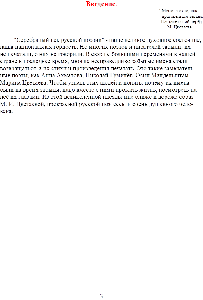 Сочинение: Поэзия Марины Ивановны ЦветаевойСочинение: Поэзия Марины Ивановны ЦветаевойМуниципальное общеобразовательное учреждение Средняя общеобразовательная школа 120 Индустриального района Алтайского краяПоэзияМарины Ивановны Цветаевой.(реферат) Работу выполнил: ученик 11 В класса Овсянников Максим Проверил: Килин Н. Е. г. Барнаул 2002 Содержание: 1. Введение………………………………………………..3 2. Биография………………………………………………4 3. Особенности творчества поэта………………………..8 4. Анализ стихотворения……………………………….10 5. Использованная литература…………………………11 2